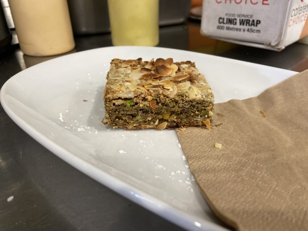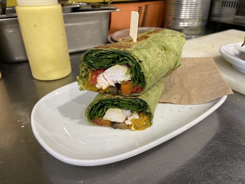 Poached chicken, roasted pumpkin and pesto on a spinach tortilla